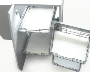 Kosz narożny DUETTO z pełnym dnem firmy FGV to produkt, który pozwoli na optymalne zagospodarowanie szafki kuchennej ze ślepymi narożnikami. System montowany jest na prowadnicach z miękkim dociągiem, co zapewnia bezproblemowe wysunięcie całej zawartości szafki na zewnątrz. Produkt wyposażony jest w cztery półki z możliwością regulacji ich wysokości. Wersja z uchwytem slowmotion eliminująca zjawisko opuszczania się frontu. System dostępny jest w wersji lewej.