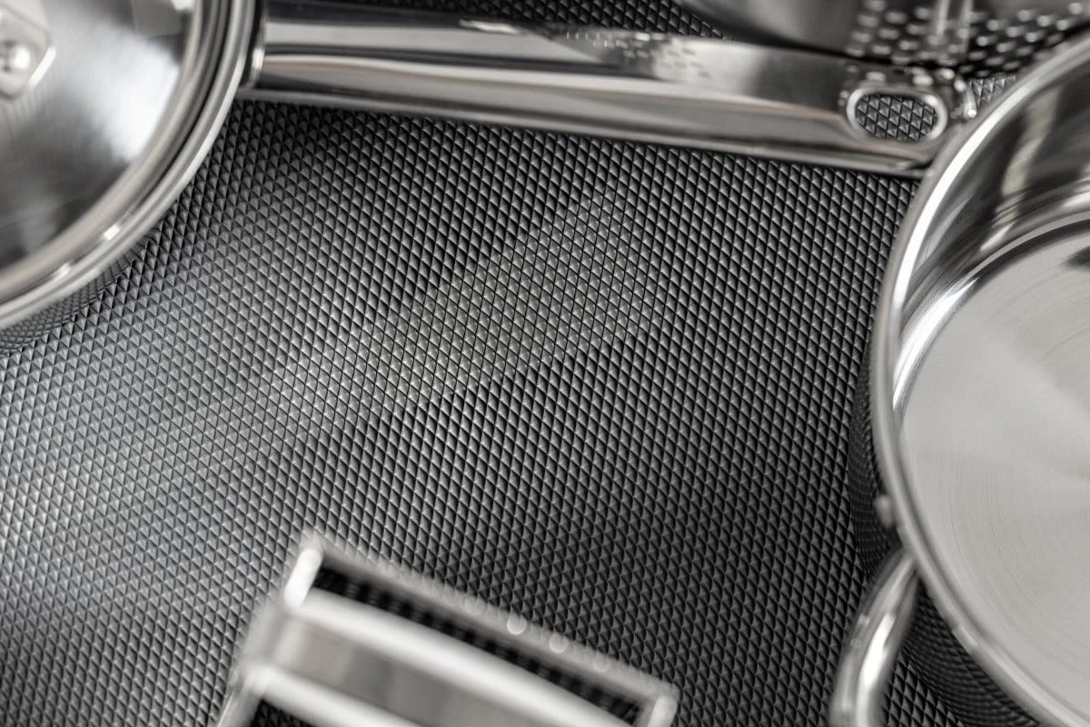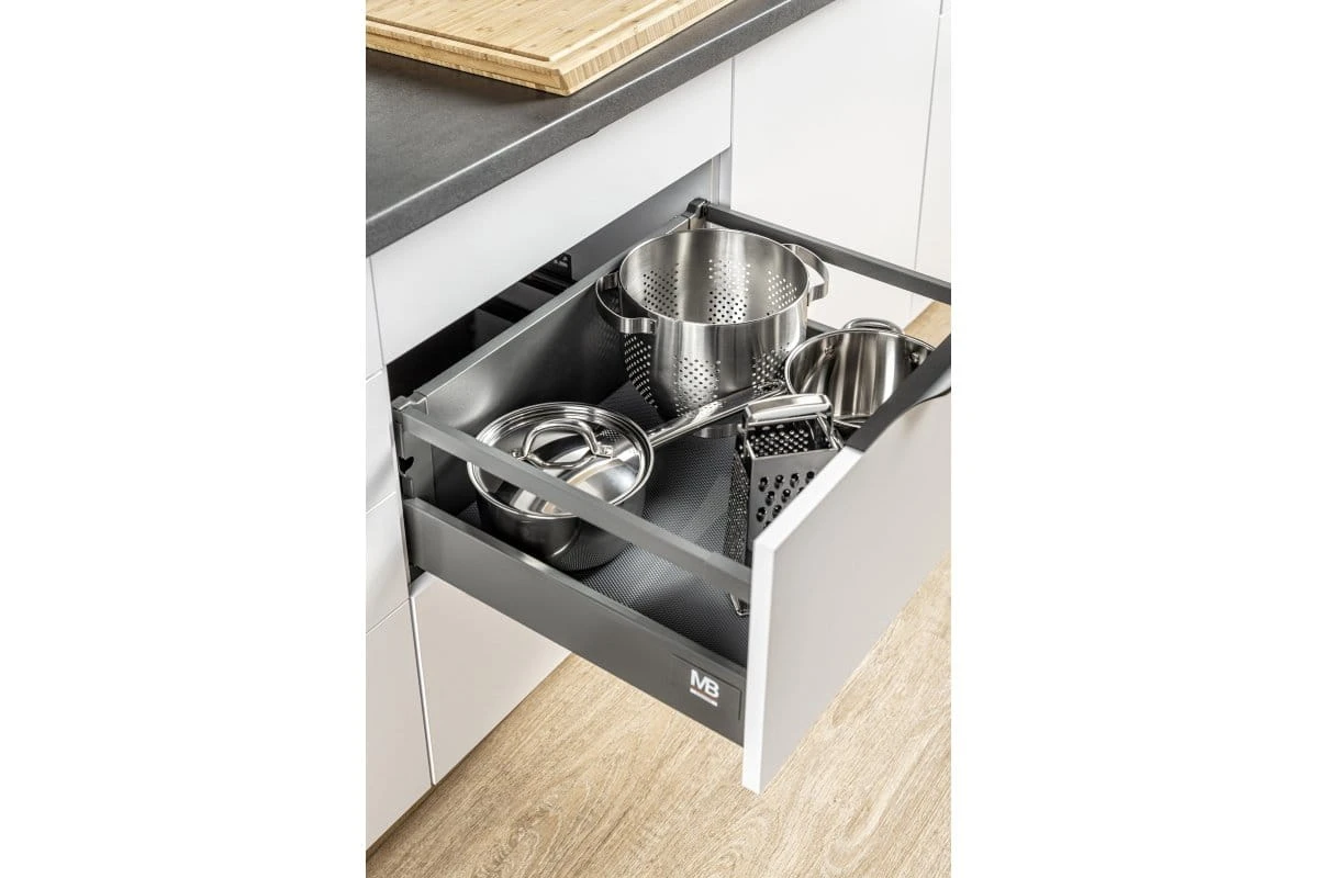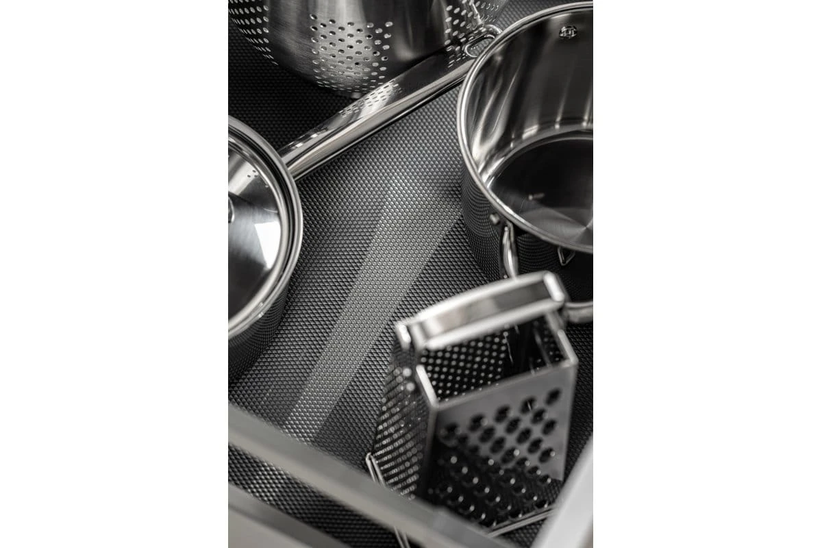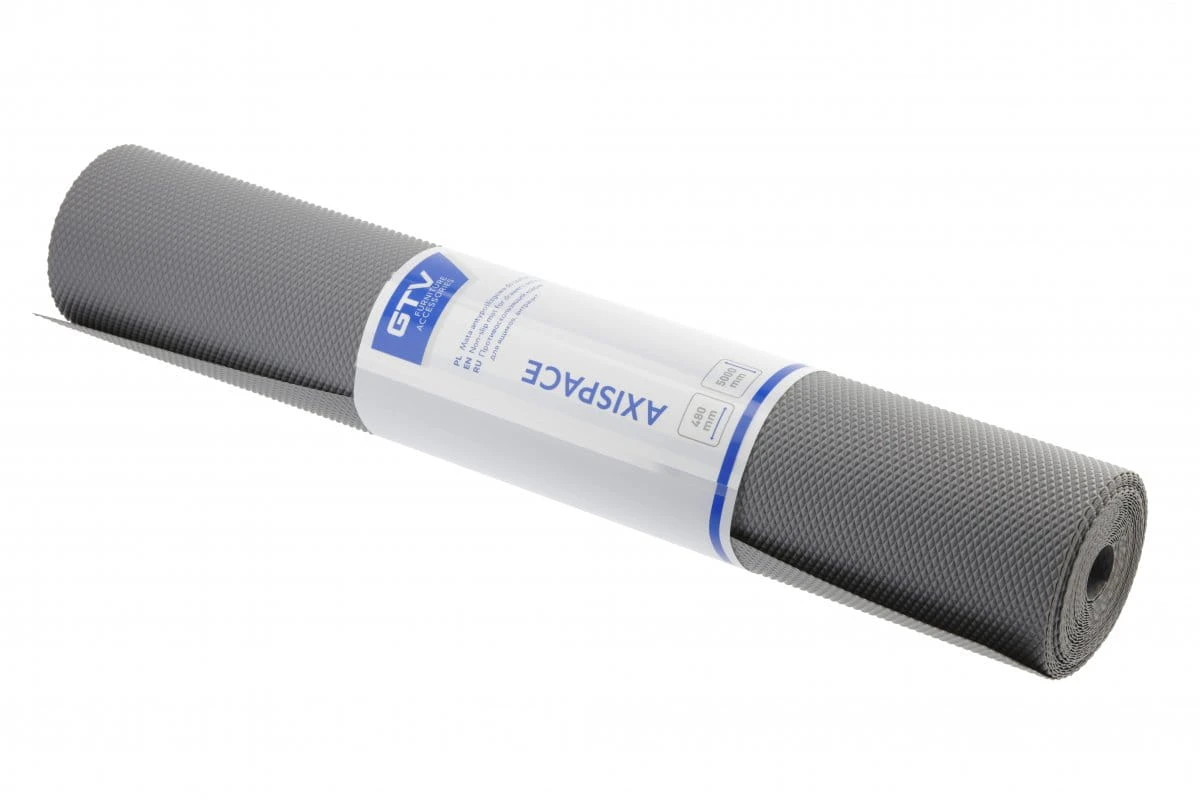 Mata antypoślizgowa AXISPACE znajdzie zastosowanie w różnego rodzaju szafkach i szufladach. Szerokość maty wynosi 480 mm a jej długość 5000 mm, ale istnieje możliwość docięcia jej na dowolny wymiar. Powierzchnia z wypustkami zapobiega przesuwaniu się przedmiotów.