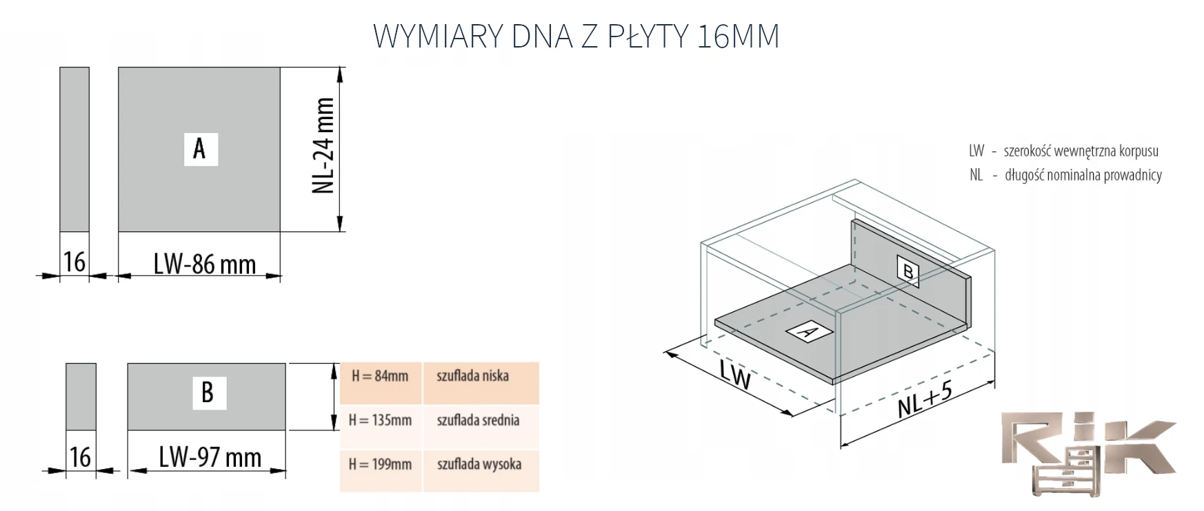- Model szuflady Boki metalowe (dno i tył z płyty gr.16mm)