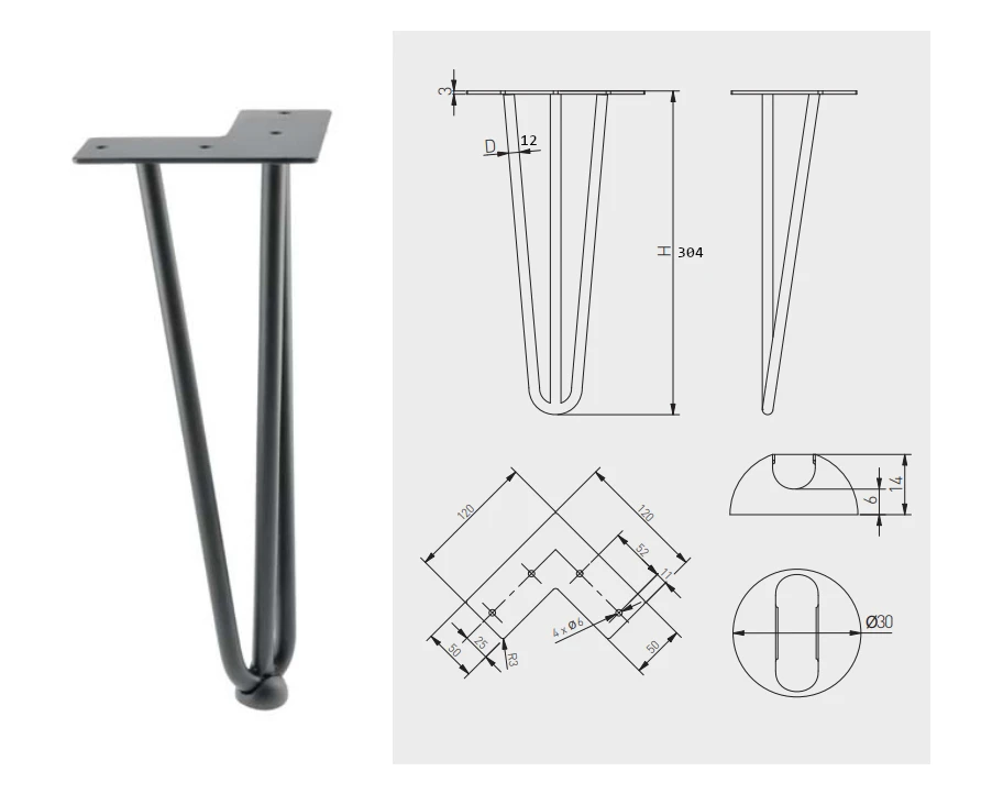 Noga hairpin ARTO ze stopką, 3 pręty, 12 x 304 mm,