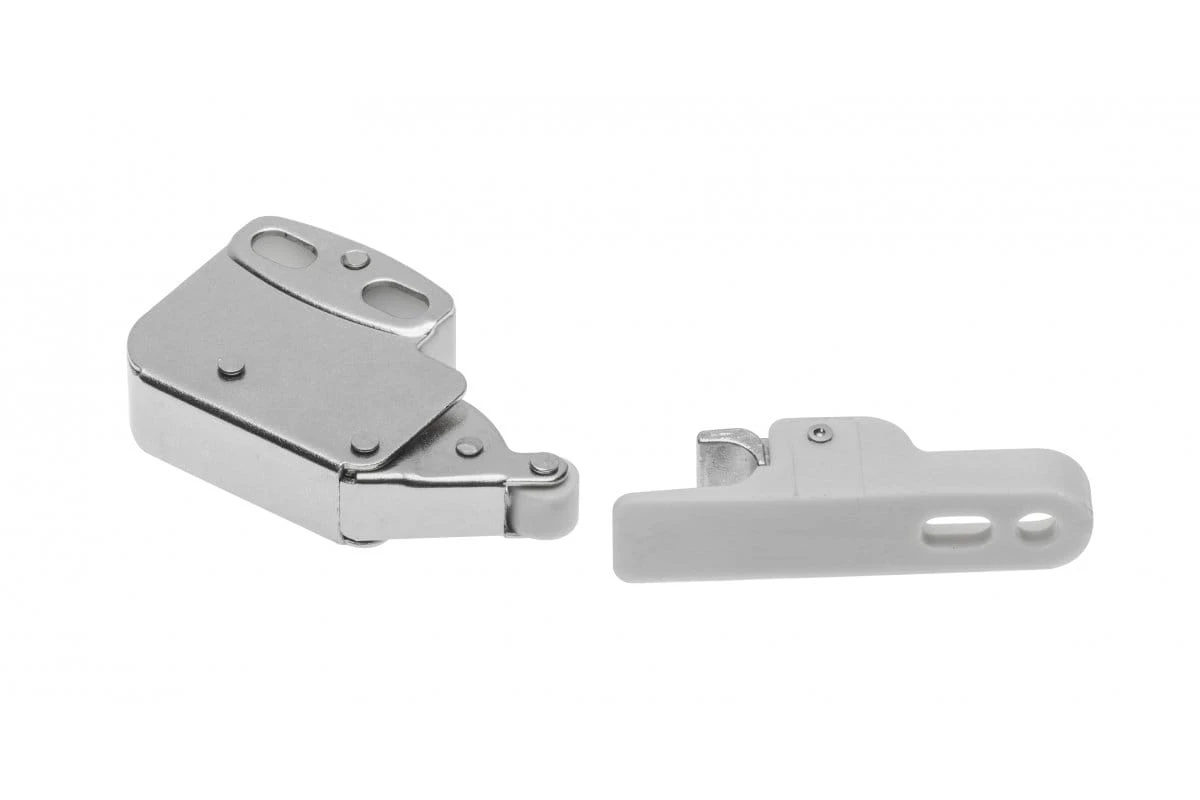 Odbojnik zatrzaskowy wykonany z tworzywa sztucznego, w kolorze białym. Wyposażony w zaczep oraz wkręty montażowe o średnicy 3,5 mm. Świetnie sprawdzi się przy montażu szafek kuchennych. Przeznaczony do frontów bezuchwytowych. Dzięki zastosowaniu odbojnika front po jego naciśnięciu otwiera się samoczynnie. Wykorzystanie wysokiej jakości technologii umożliwia sprawne otwieranie frontu poprzez jego naciśnięcie, a także zapobiega samo otwarciu frontu po zamknięciu. Szczelina między frontem a korpusem min. 2,5 mm.