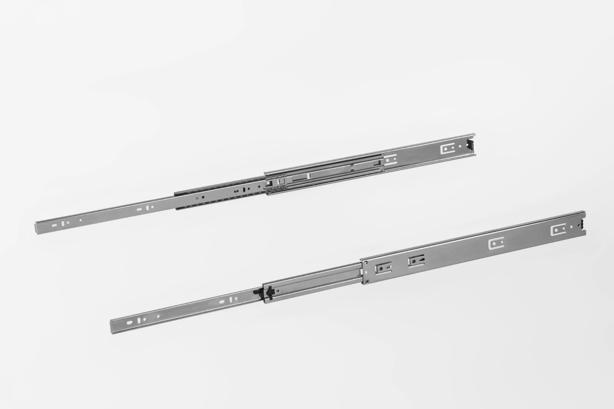 • Przydatne progresywne prowadnice z pełnym wysuwem na łożyskach kulkowych • Mocowanie do szuflady za pomocą wkrętów do płyt wiórowych • Lepsze ślizganie na stalowych łożyskach kulkowych Odblokowanie urządzenia • Pełny wysuw dla lepszej dostępności i zwiększony komfort • Doskonała nośność przy standardzie dynamicznym 35 kg pojemność w całym zakresie