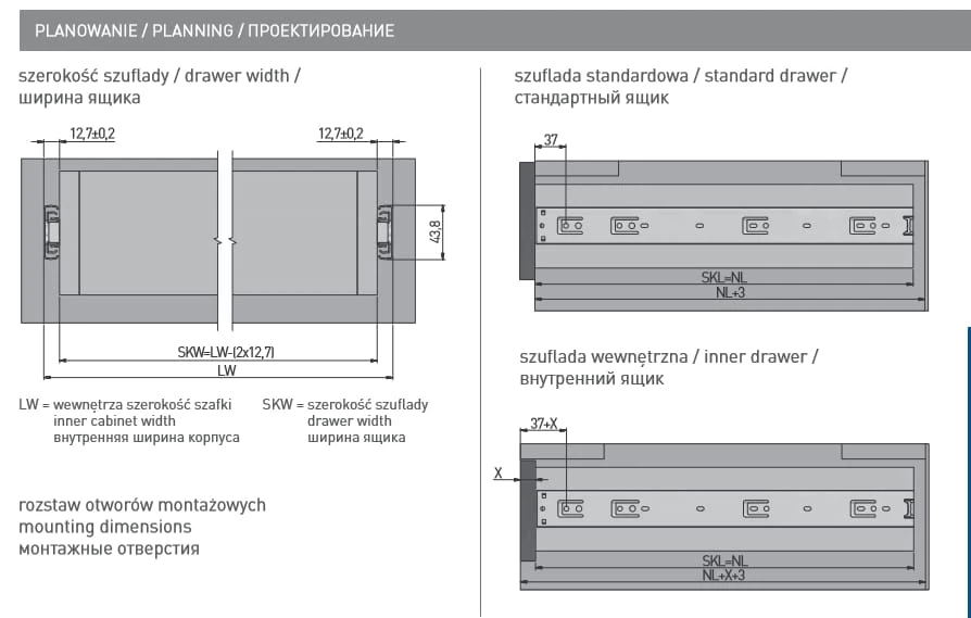 Prowadnica kulkowa renomowanej firmy GTV do szuflad skrzyniowych z pełnym wysuwem.