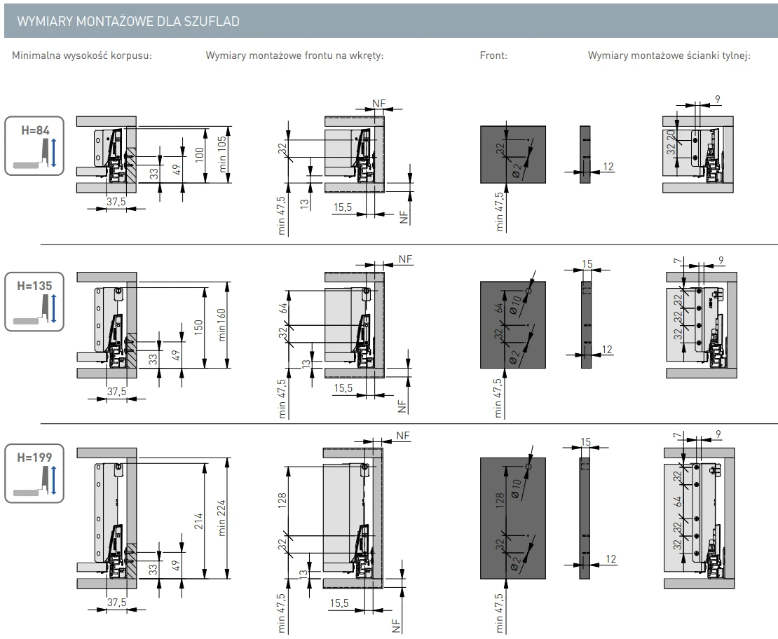 - szerokim zakresem regulacji w 3 płaszczyznach (pion, poziom i nachylenie frontu), co umożliwia precyzyjne ulokowanie szuflady we wnęce,
