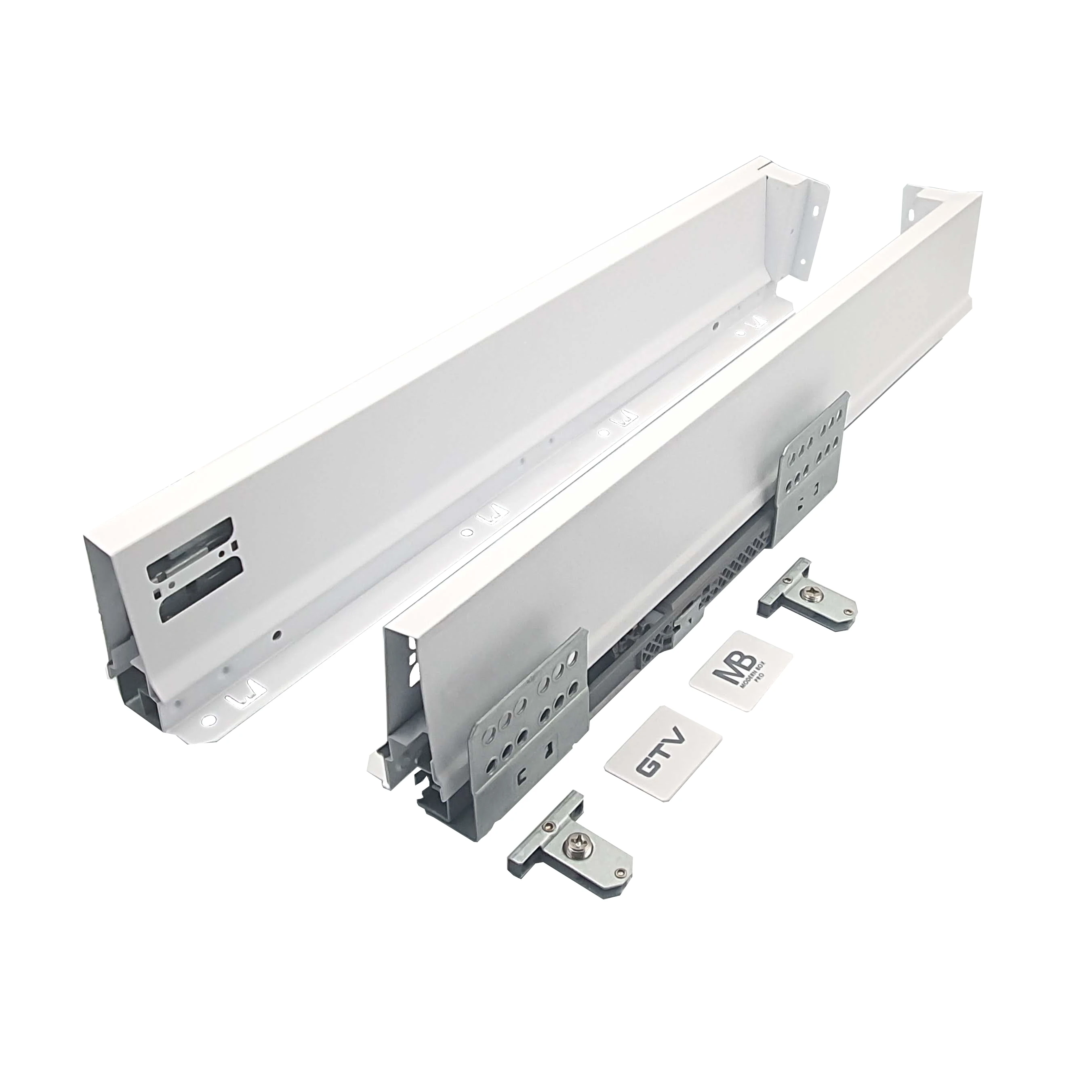 Szuflada MB PRO charakteryzuje się prostym bokiem na zewnętrznej stronie oraz regulacją ukrytą wewnątrz, co nadaje nowoczesny desing, który jest obecnie modnym trendem w meblach kuchennych, łazienkowych czy salonowych.