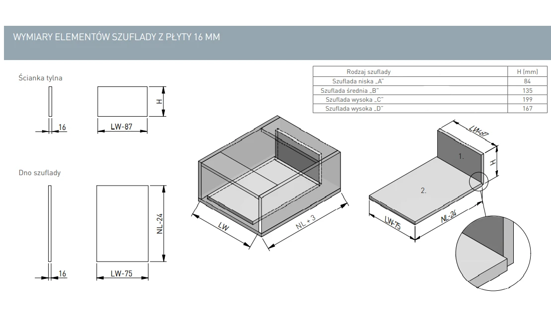 - Model szuflady Boki metalowe (dno i tył z płyty gr.16mm)