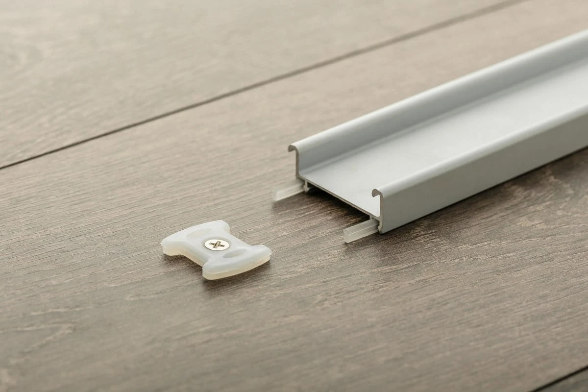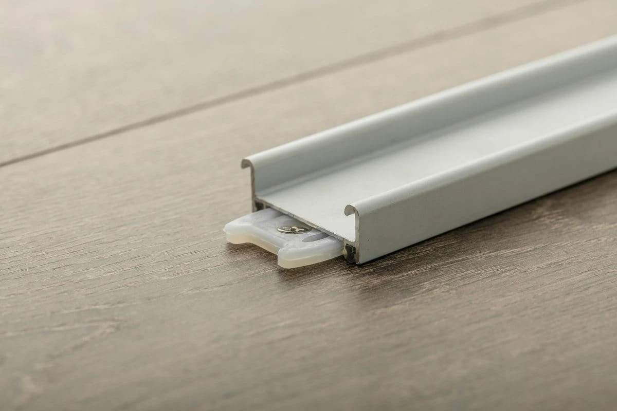 Tor dolny EVO 2 jest dostępny z uszczelkami, które są montowane pod samym profilem i zapobiegają powstawaniu niepotrzebnego hałasu i zabrudzeń. Należy również pamiętać, że profil jest mocowany na plastikowej klipsie i nie wymaga wiercenia otworów w elemencie aluminiowym. Zalecamy utrzymywanie dolnego toru w czystości.
