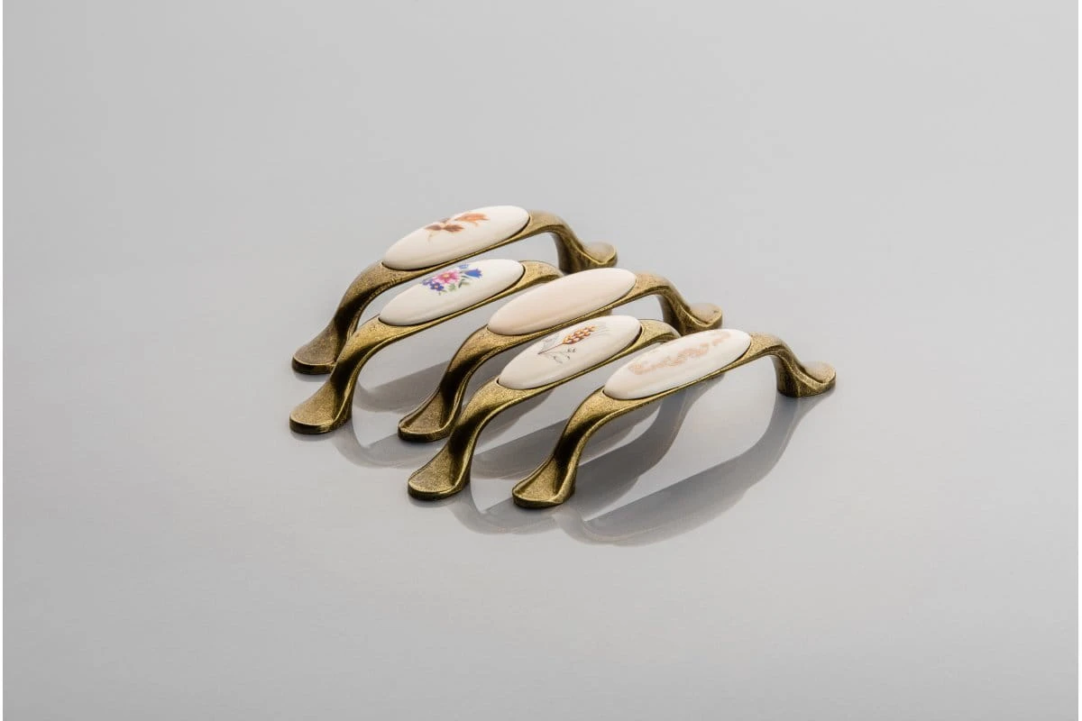 Uchwyt meblowy 728P w stylu retro nada nietuzinkowego klimatu wnętrzu. Będzie idealnie komponował się z drewnianymi frontami. Stylowe i eleganckie uchwyty z kolekcji 728P posiadają porcelanowe elementy z oryginalnymi zdobieniami w siedmiu motywach: blue rose (niebieska róża), orient gold (bogate zdobienie w kolorze złota), ornament (finezyjne zdobienie w kolorze złota), autumn rose (jesienny kwiat), spring flower (wiosenne kwiaty), country (źdźbło zboża) oraz milky (mleczna porcelana). Zróżnicowanie dostępnych wzorów pozwoli na dopasowanie odpowiedniego motywu do dekoracji w mieszkaniu. Podstawa uchwytu wykonana jest ze ZnAlu w kolorze antycznego mosiądzu. Uchwyty dostępne są w rozstawie 96 mm i długości 125 mm.