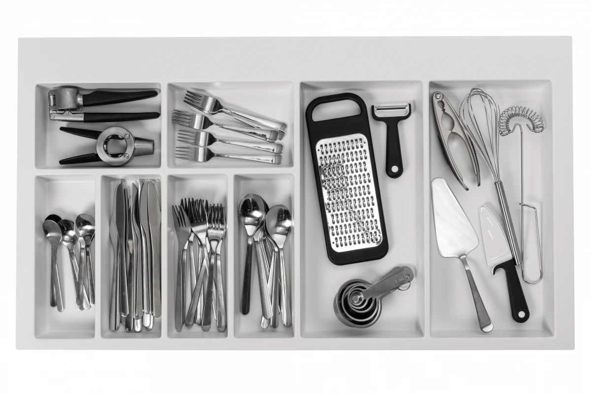 Wykonane z wysokiej jakości tworzywa wkłady do szuflad Axispace pozwalają efektywnie zagospodarować wnętrza szuflad kuchennych. Dzięki specjalnym podziałkom mamy możliwość odpowiedniego posegregowania i uporządkowania łyżek, noży, widelców i innych przydatnych akcesoriów kuchennych. Efekt wizualny to jednak nie jedyna zaleta tego produktu. Wkłady do szuflad są bardzo pojemne i praktyczne oraz pozwalają mieć wszystko w zasięgu ręki, co jest niezwykle istotne dla każdej osoby zajmującej się gotowaniem. W ofercie dostępne są segregatory o różnej wielkości (340-840 mm).