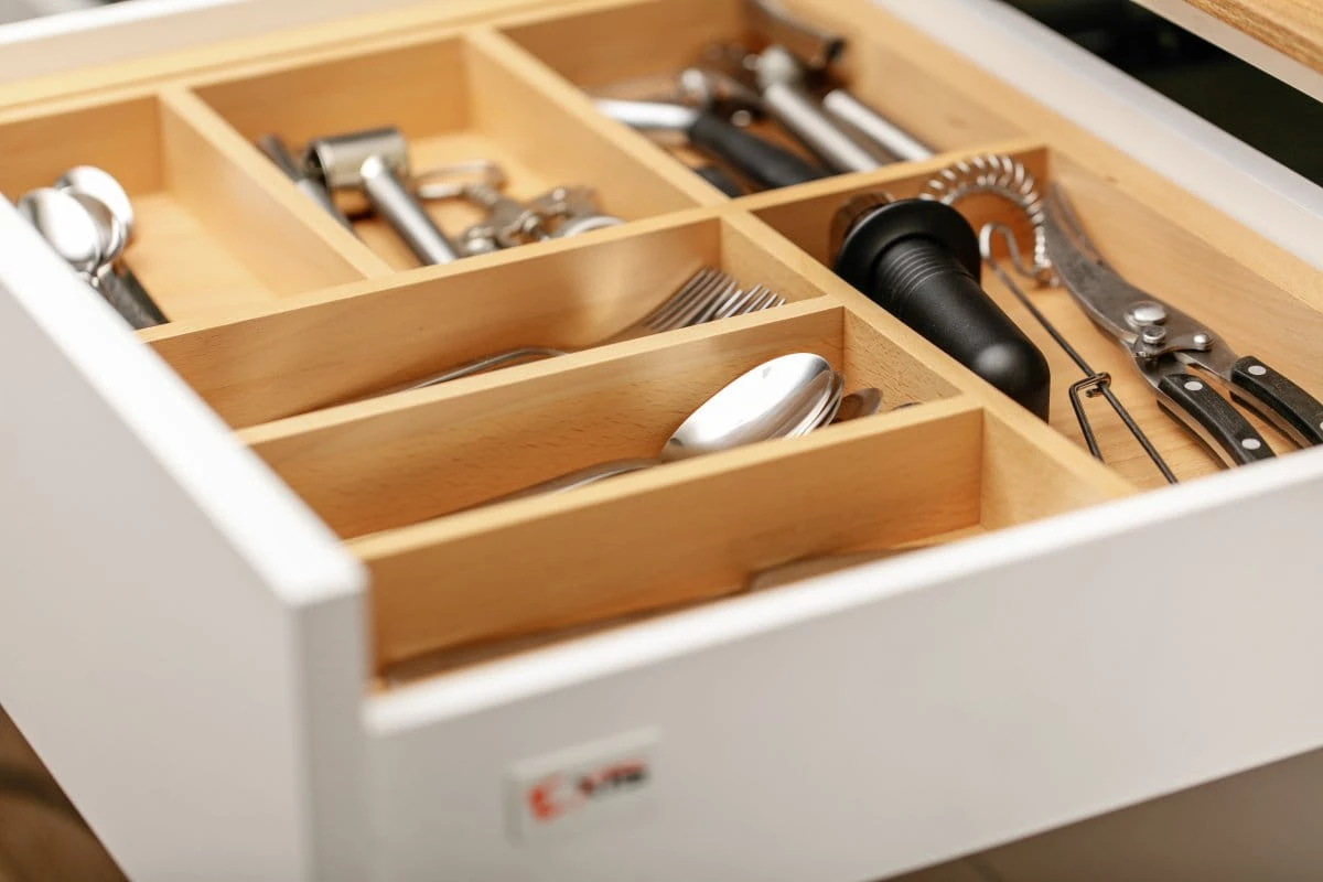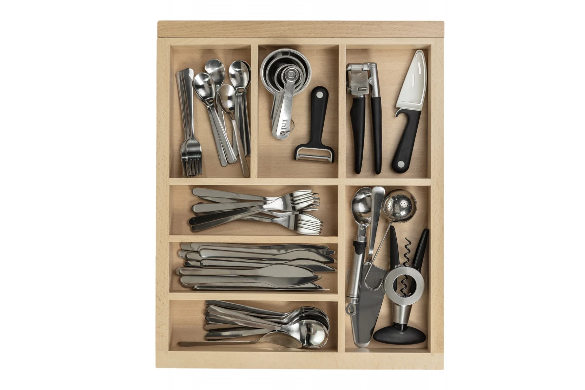 Organizery to obowiązkowy element wyposażenia szuflad nowoczesnych mebli – dzięki nim są one funkcjonalnie zagospodarowane, uporządkowane oraz wygodne w użytkowaniu. Seria wkładów CUSTOMI marki GTV przeznaczona jest do systemu szuflad MODERN BOX i AXIS PRO – stanowi ich funkcjonalne dopełnienie i praktyczną ozdobę. Wkłady CUSTOMI zostały wyprodukowane z wysokogatunkowego drewna bukowego, co wpływa na ponadczasowy styl tej kolekcji. Drewno, ze względu na swój uniwersalny charakter, będzie pięknie komponowało się z każdą zabudową kuchenną. Co więcej organizery wykończono matowym lakierem, który zapewnia dodatkową ochronę przed uszkodzeniami, a także podkreśla i wydobywa ciepły kolor drewna bukowego.