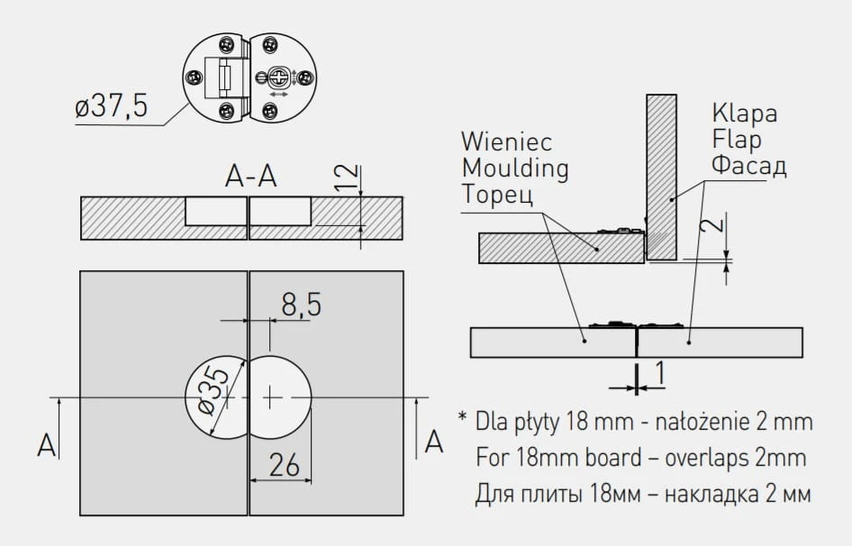 Zawias meblowy barkowy do podnośnika VIM - niklowany